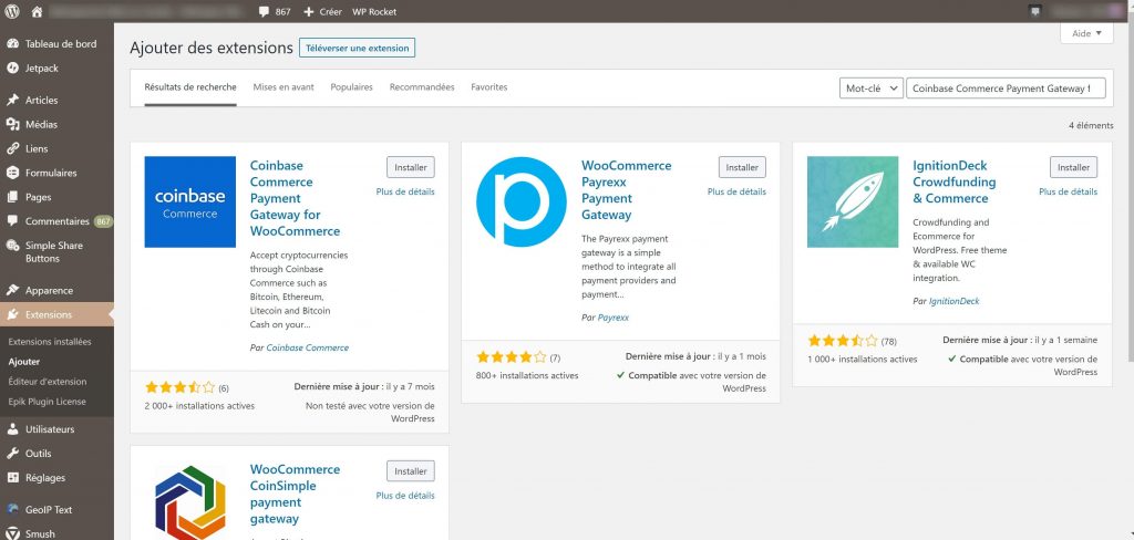 - Cliquez Ajouter des extensions, ensuite cherchez et installez Coinbase Commerce Payment Gateway for WooCommerce